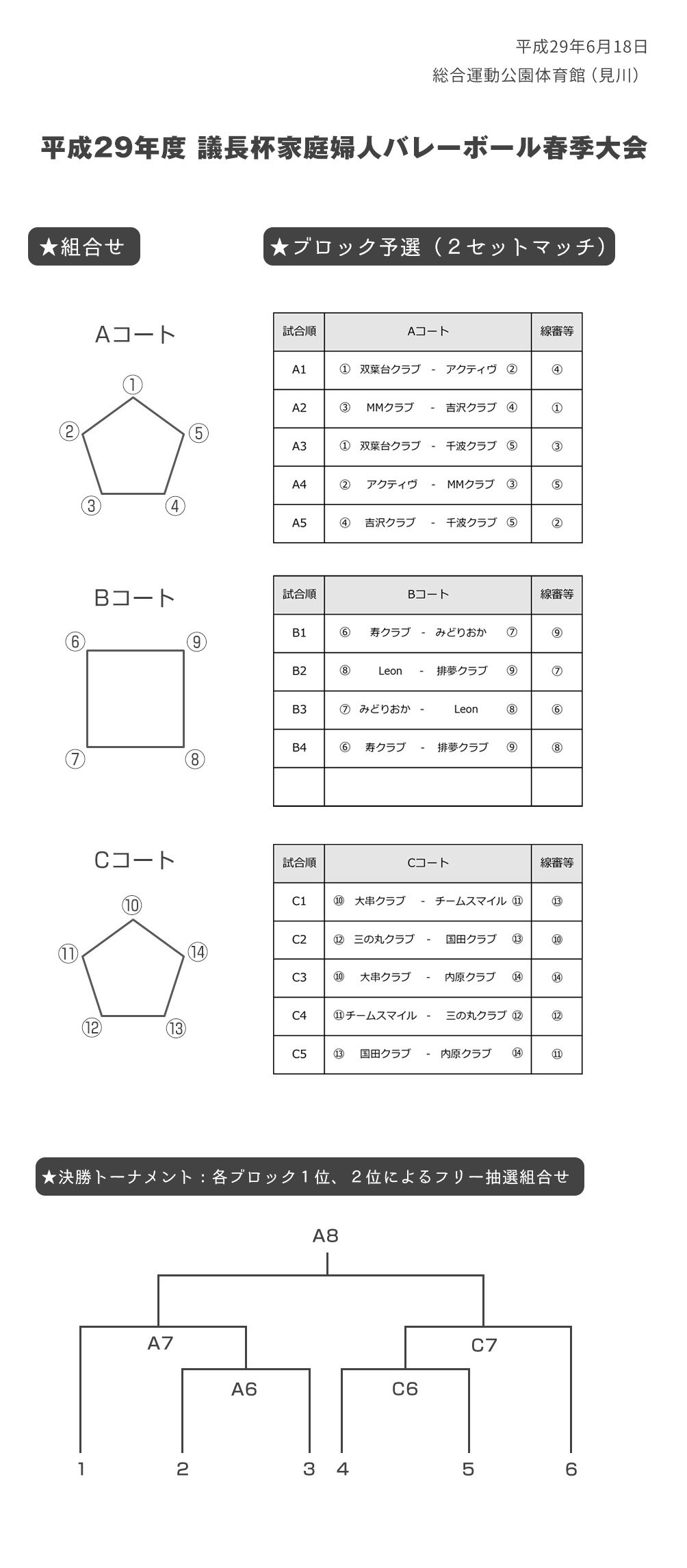 平成29年6月18日に水戸市見川の総合運動公園体育館で開催される「議長杯争奪 家庭婦人バレーボール大会」の試合組合わせが決定致しましたので発表致します。